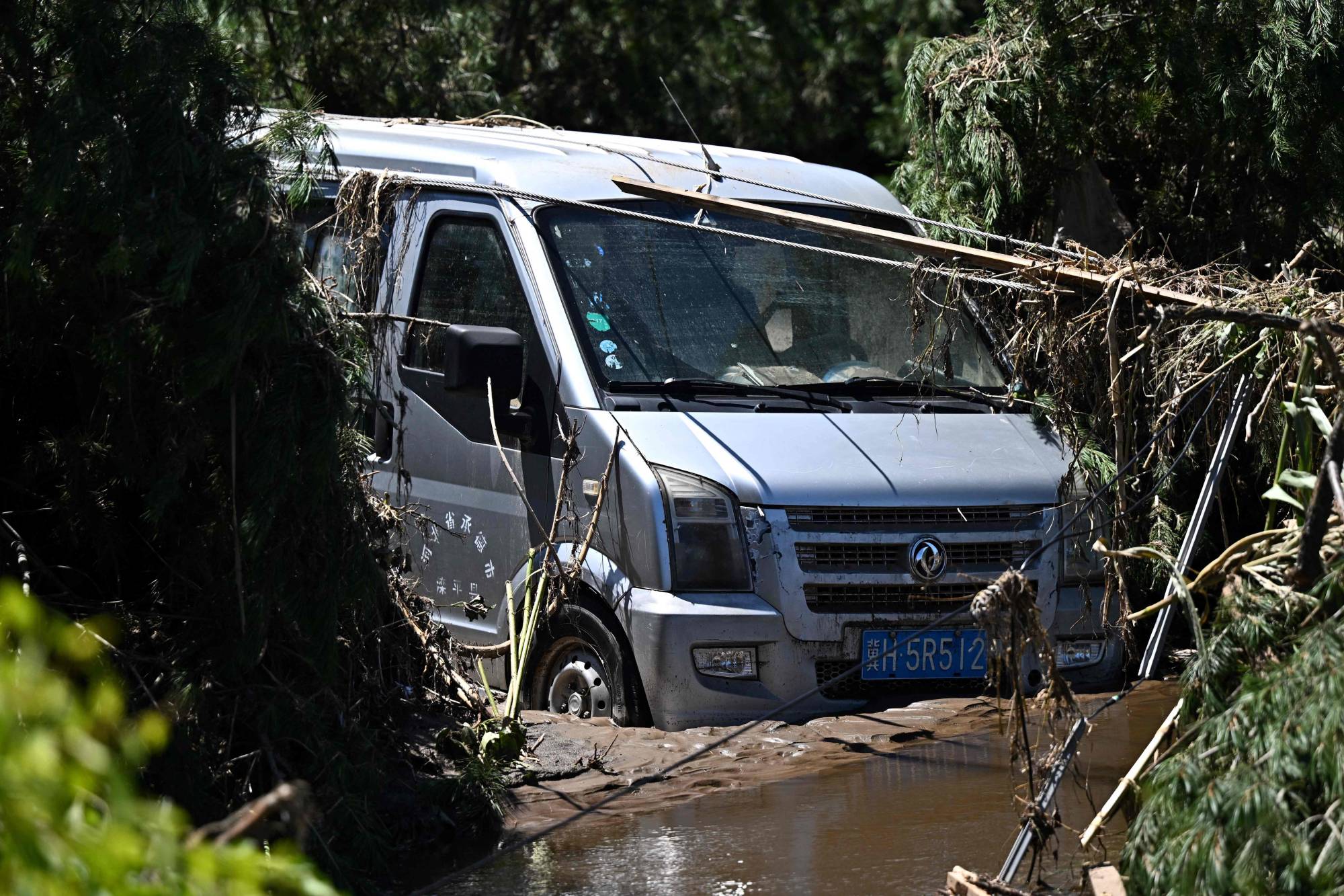 سيارة متضررة من الفيضانات بعد هطول أمطار غزيرة خلال الأيام القليلة الماضية في منطقة هوايرو على مشارف بكين (أ.ف.ب)