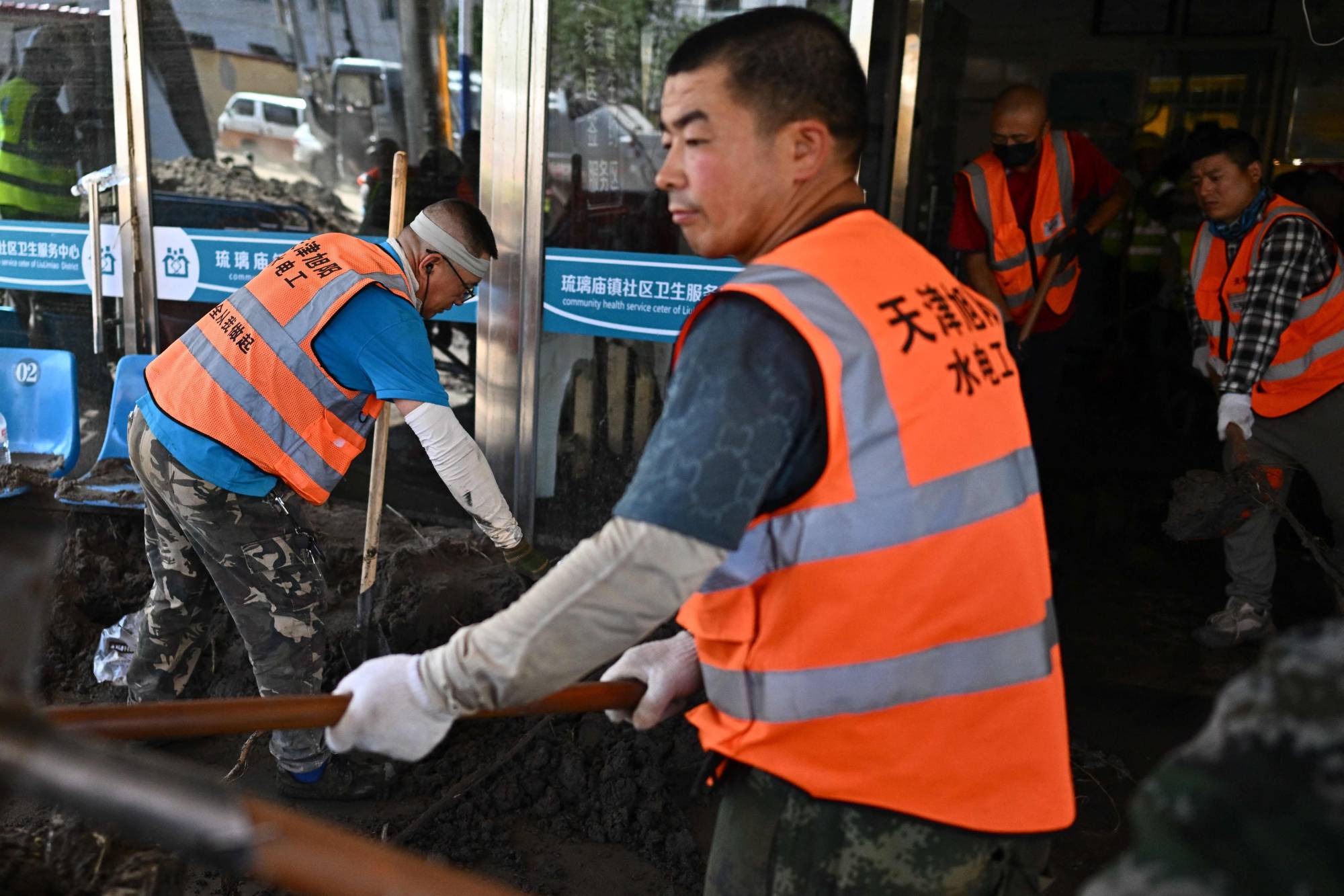يقوم الناس بتنظيف الأضرار التي لحقت بمركز صحي بسبب الأمطار الغزيرة خلال الأيام القليلة الماضية في منطقة هوايرو على مشارف بكين (أ.ف.ب)
