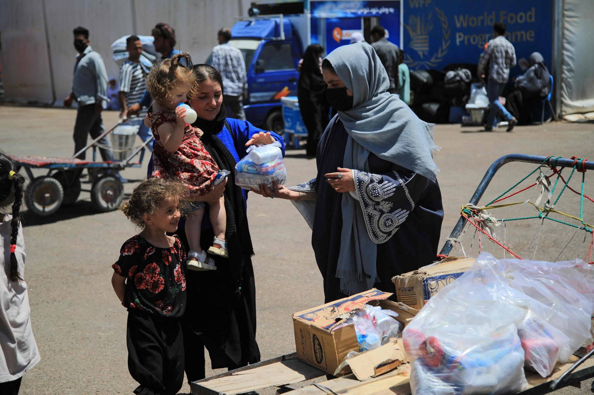 فاطمة رضائي (يمين في الأمام) متطوعة أفغانية توزع إمدادات الإغاثة على المهاجرين الأفغان الواصلين حديثاً والمُرحَّلين من إيران عند معبر «إسلام قلعة» الحدودي في ولاية هرات (أ.ف.ب)