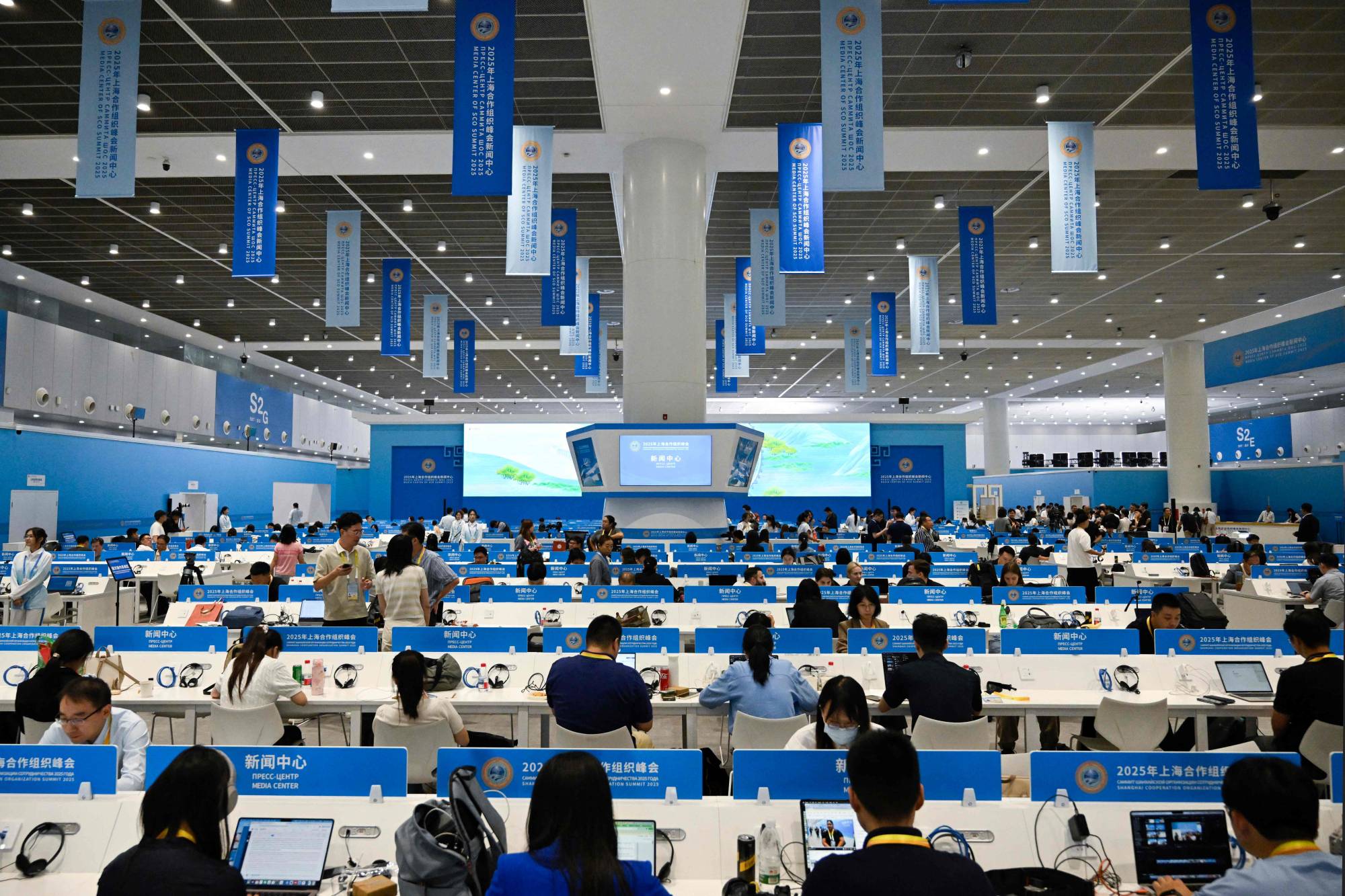 مشهد عام للمركز الإعلامي الذي سيغطي فيه صحافيون قمة منظمة شنغهاي للتعاون في تيانجين (أ.ف.ب)