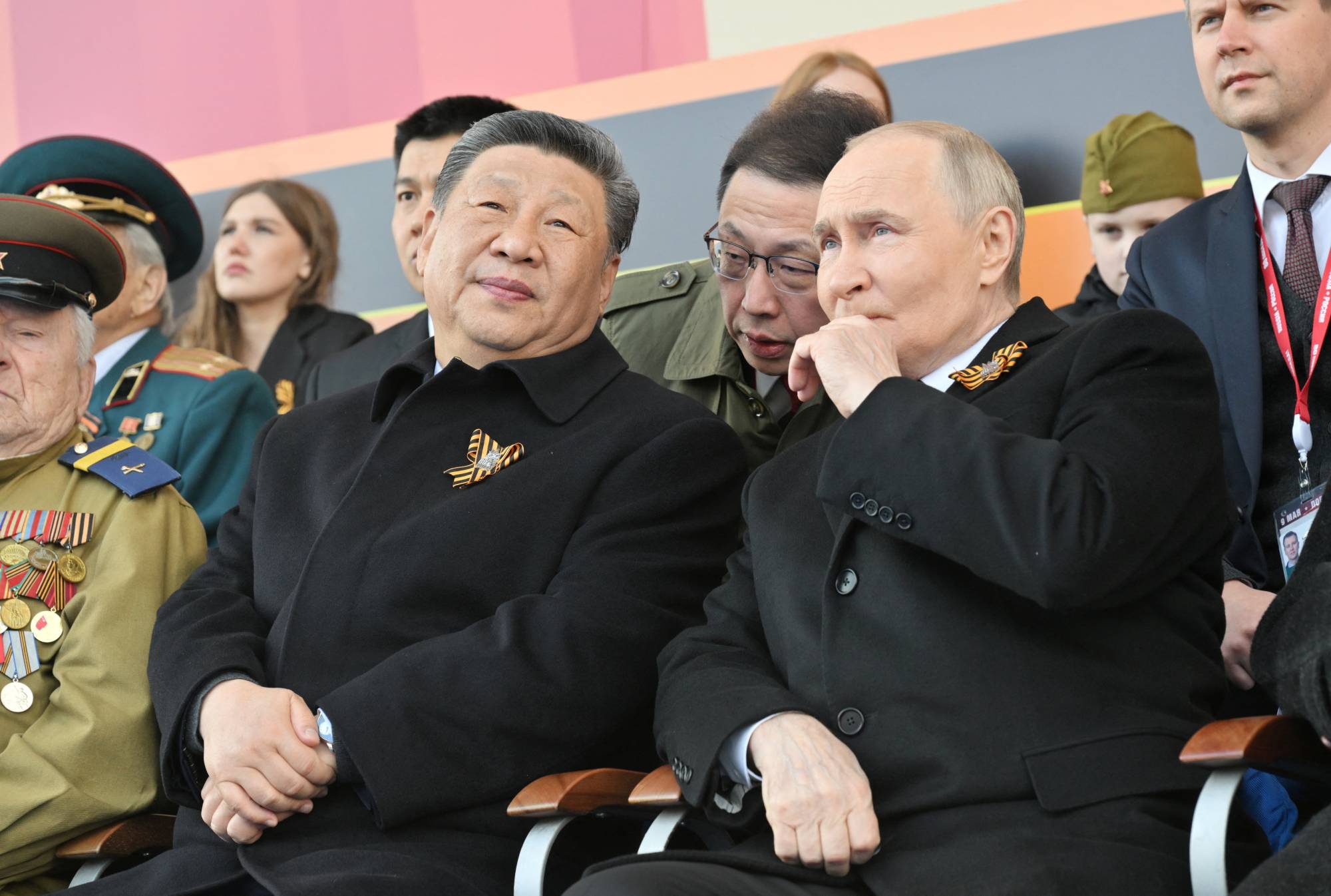 الرئيس الروسي فلاديمير بوتين ونظيره الصيني شي جينبينغ يحضران عرضاً عسكرياً في يوم النصر إحياءً للذكرى الثمانين للانتصار على ألمانيا النازية في الحرب العالمية الثانية بالساحة الحمراء وسط موسكو... 9 مايو 2025 (رويترز)