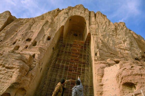 سائح أميركي (على اليمين) ومرشده الأفغاني خلال زيارة العام الماضي إلى ما تبقى من تماثيل بوذا التي يبلغ عمرها 1600 عام والتي دمرتها «طالبان» في أفغانستان (نيويورك تايمز)