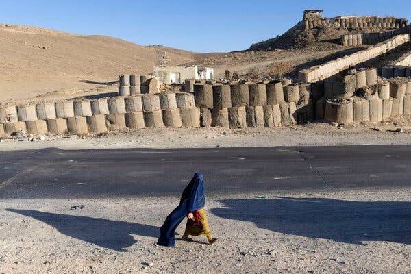امرأة تسير أمام موقع عسكري مهجور قرب غزنة بأفغانستان في ديسمبر (نيويورك تايمز)