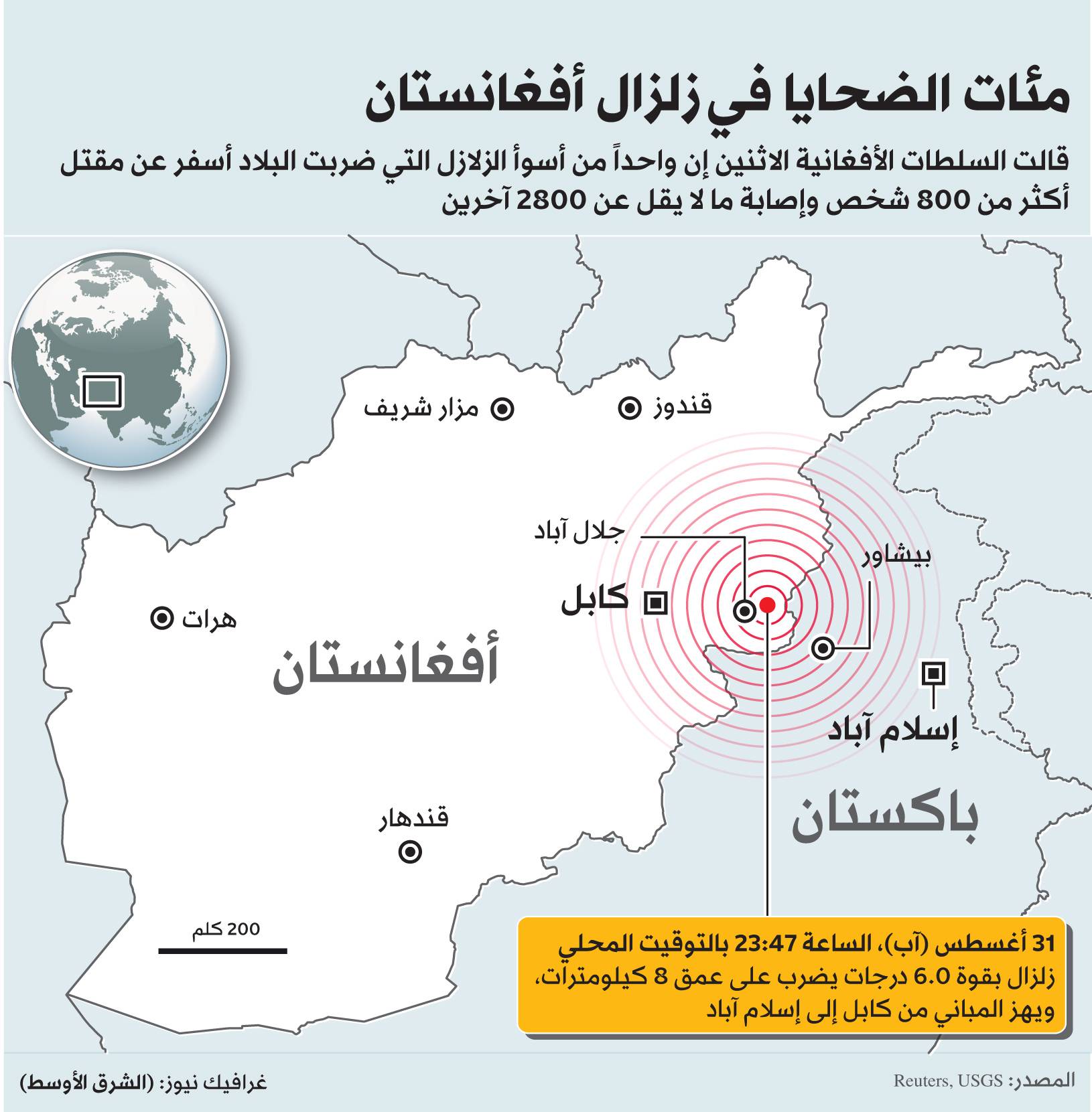 لقي أكثر من 800 شخص مصرعهم، وأُصيب أكثر من 2700 آخرين، جراء الزلزال الذي ضرب شرق أفغانستان ليل الأحد، بقوة 6 درجات، وأعقبته 5 هزّات ارتدادية على الأقل شعر بها السكان على بعد مئات الكيلومترات. ووفقاً لهيئة المسح الجيولوجي الأميركية، فإن الزلزال وقع على عمق ضحل بلغ 8 كيلومترات بالقرب من الحدود الأفغانية مع باكستان.