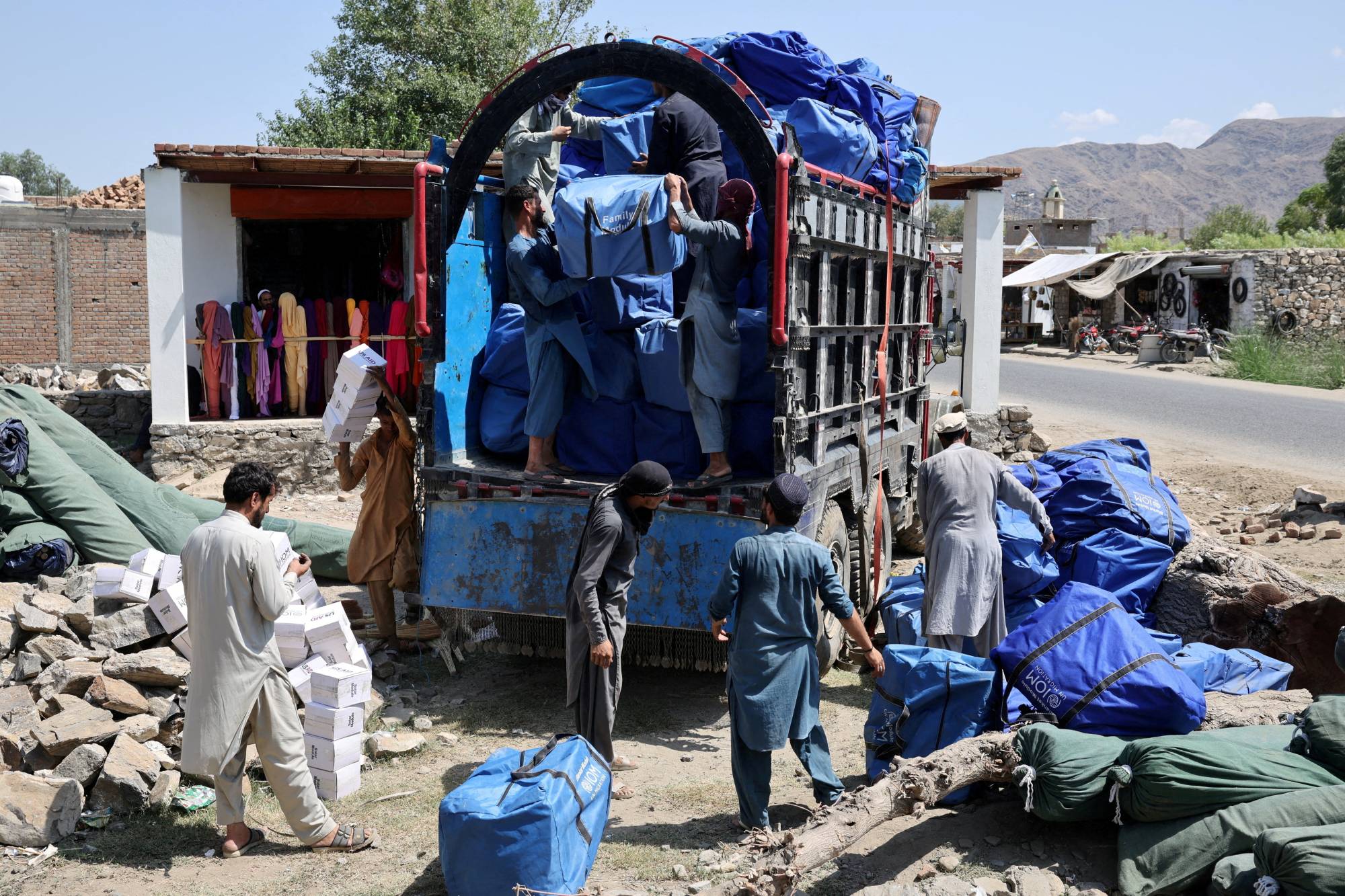 عمال يحملون مساعدات لنقلها إلى متضررين في مقاطعة كونار الأفغانية (أرشيفية - رويترز)