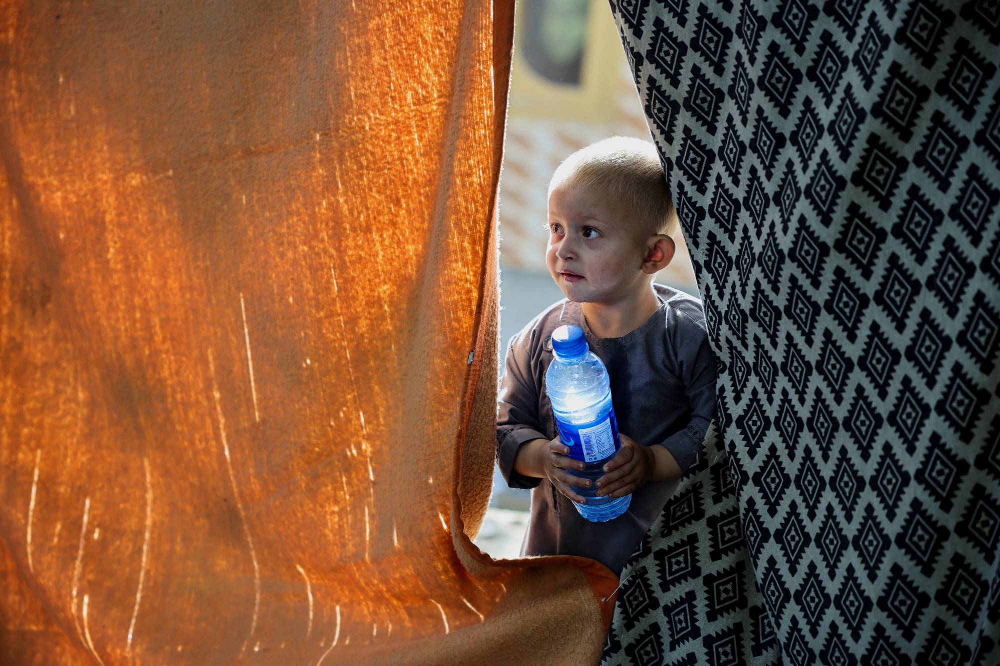 طفل يحمل قنينة ماء بعدما نزح مع عائلته إلى مكان آمن بعد الزلزال في مقاطعة نانغرهار الأفغانية (أرشيفية - رويترز)