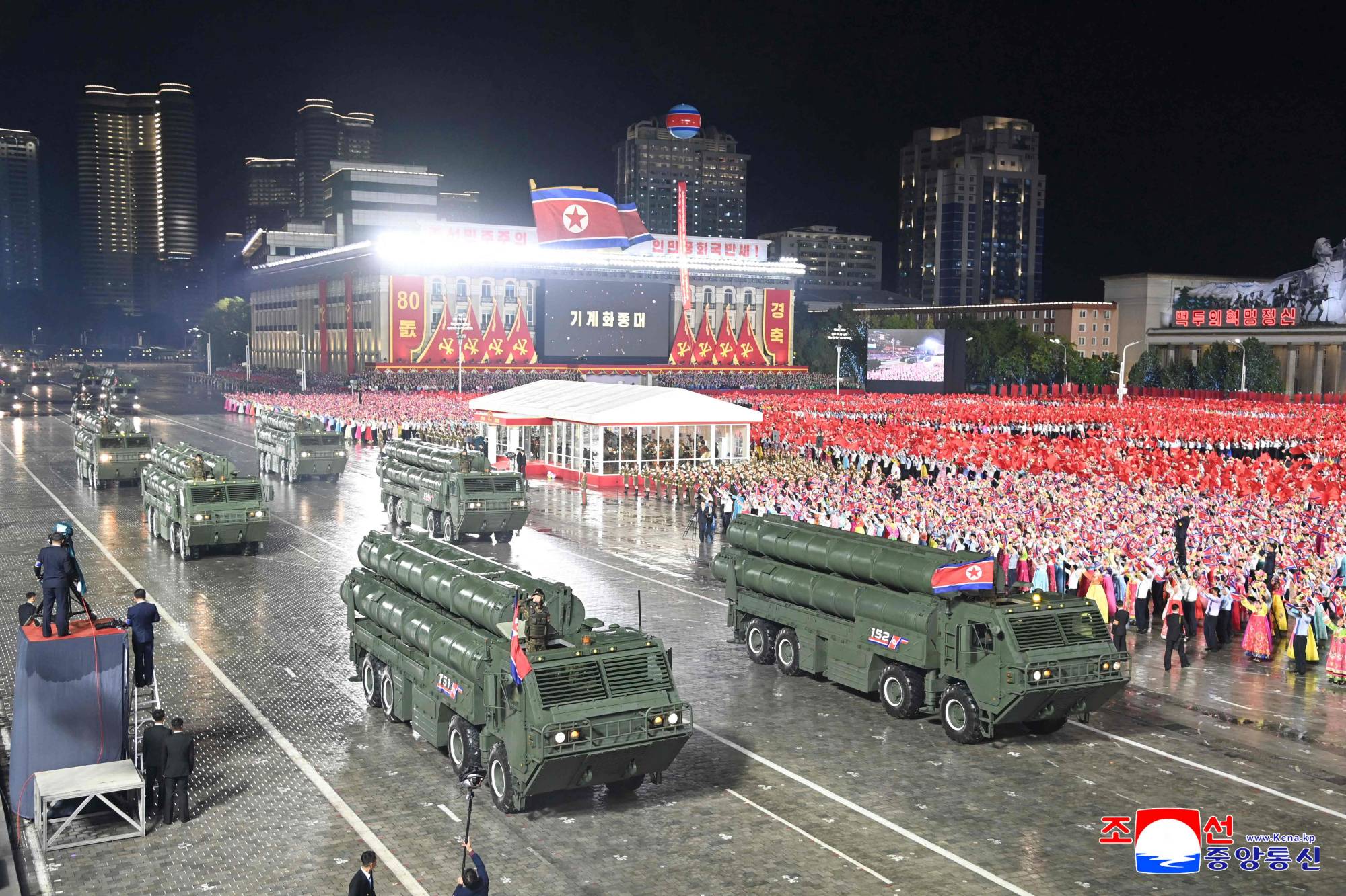 صواريخ تظهر خلال العرض العسكري للاحتفال بالذكرى الثمانين لتأسيس حزب العمال الكوري في ساحة كيم إيل سونغ في بيونغ يانغ (أ.ف.ب)