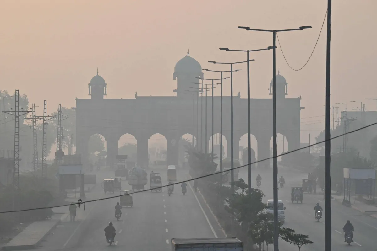 يتنقل الركاب على طول الطريق وسط ظروف ضبابية في لاهور 24 أكتوبر 2025 (أ.ف.ب)