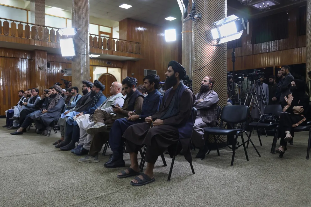 مسؤولون وصحافيون يحضرون مؤتمراً صحافياً لـ«طالبان» في مركز الإعلام والمعلومات الحكومي بكابل - أفغانستان - 12 أكتوبر 2025 (أ.ب)