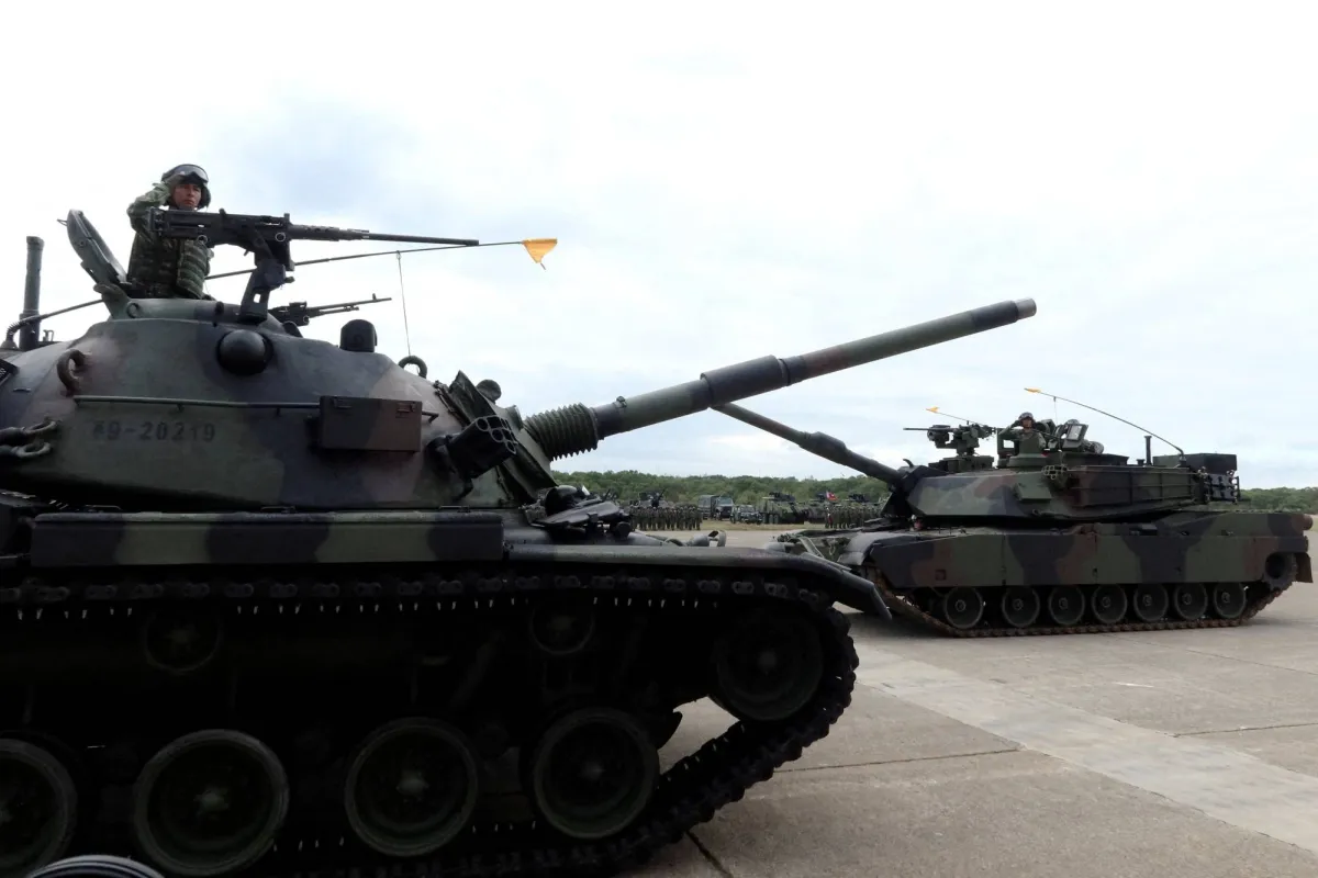 دبابة «بريف تايغر» وأخرى من طراز «إبرامز M1A2T» تشاركان في حفل تدشين أول كتيبة دبابات تايوانية من طراز إبرامز، في قاعدة هوكو العسكرية في هسينشو (رويترز)