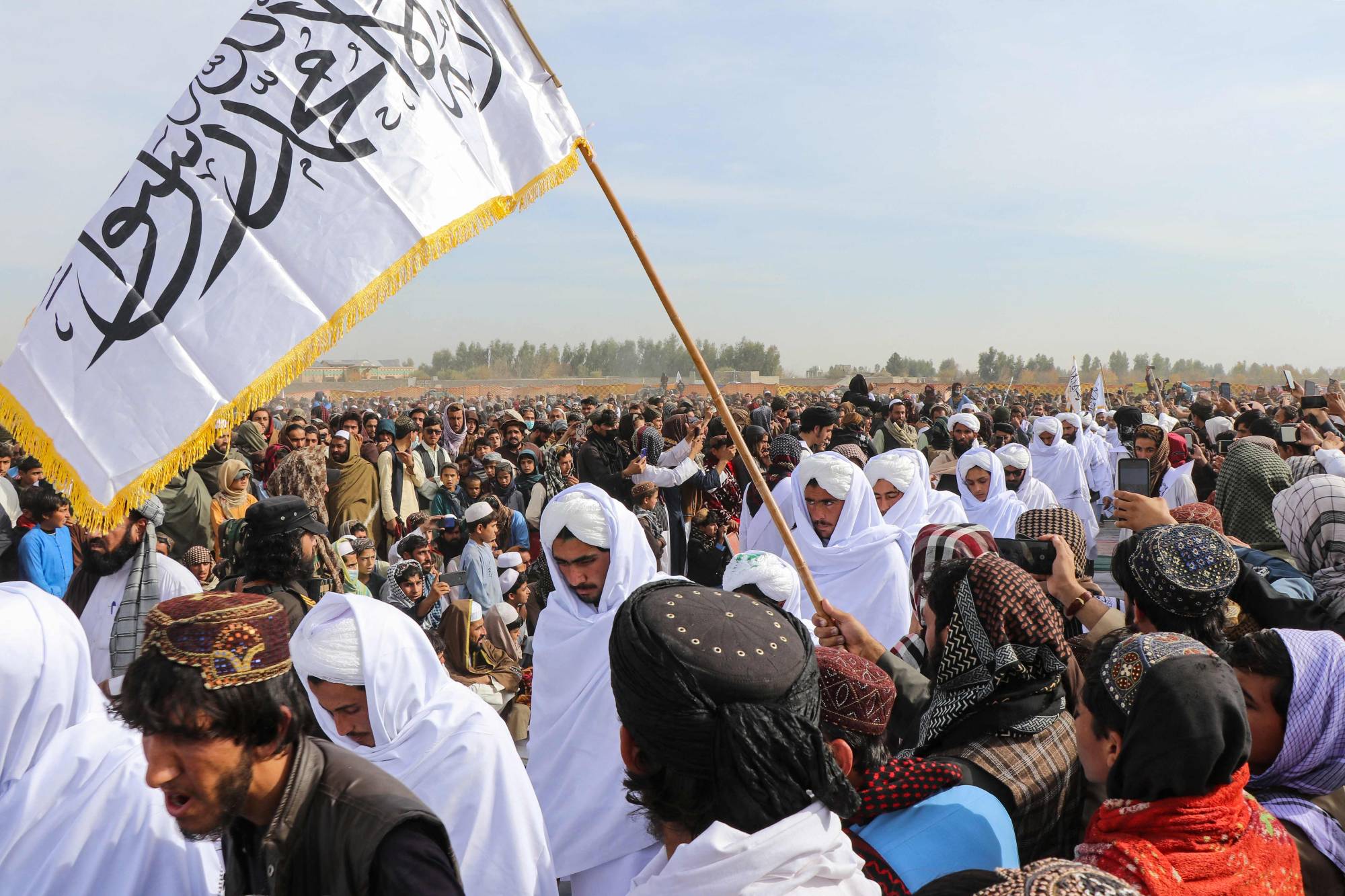 يلوّح الأفغان بعَلم «طالبان» بينما يحضر رجال الدين والقراء الجدد من مدرسة إسلامية أو مدرسة دينية حفل تخرُّجهم في منطقة صابري بولاية خوست 10 ديسمبر 2025 (أ.ف.ب)