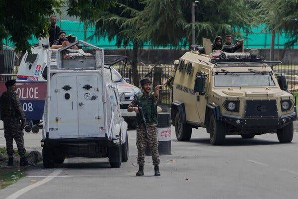 جندي هندي يقوم بتطهير الطريق يوم الاثنين عند نقطة تفتيش بالقرب من موقع اشتباك مسلح على مشارف سريناغار في المنطقة الخاضعة للسيطرة الهندية (أ.ب)