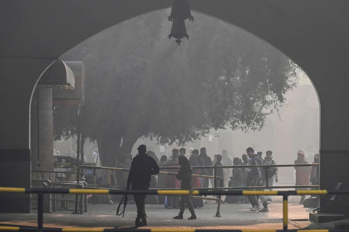 يقف أفراد الأمن في حالة تأهب وسط ضباب كثيف في محطة قطار في لاهور بتاريخ 28 ديسمبر الحالي (أ.ف.ب)