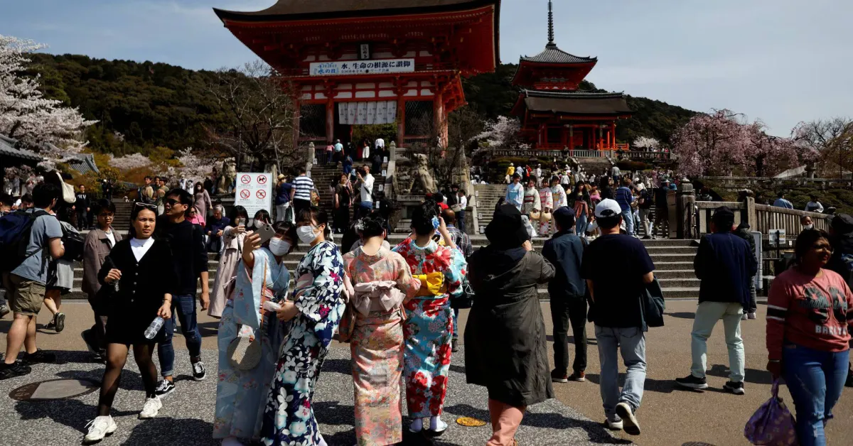 حشد من السياح بمعبد في كيوتو غرب اليابان 30 مارس 2023 (رويترز)