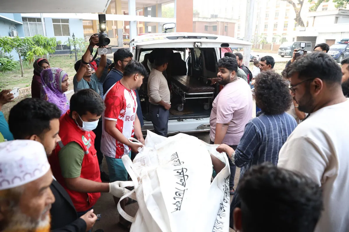جثث ضحايا حادث الحافلة خلال نقلها إلى مستشفى راجباري الحكومي في العاصمة دكا (إ.ب.أ)