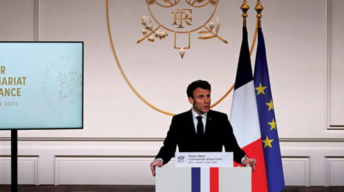 الرئيس الفرنسي إيمانويل ماكرون يلقي كلمته عن أفريقيا في قصر الإليزيه (أ.ف.ب)