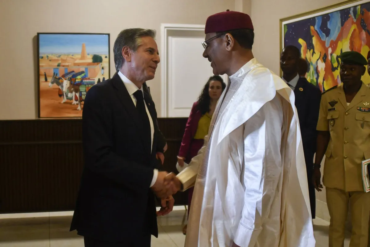 وزير الخارجية الأميركي أنتوني بلينكن يصافح رئيس النيجر محمد بازوم خلال لقائهما في القصر الرئاسي في نيامي في 16 مارس 2023 (أرشيفية/أ.ف.ب)