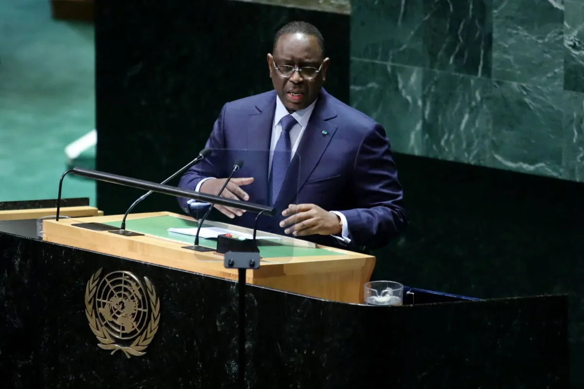 الرئيس السنغالي ماكي سال خلال كلمته أمام الجمعية العامة للأمم المتحدة في نيويورك (أ.ف.ب)
