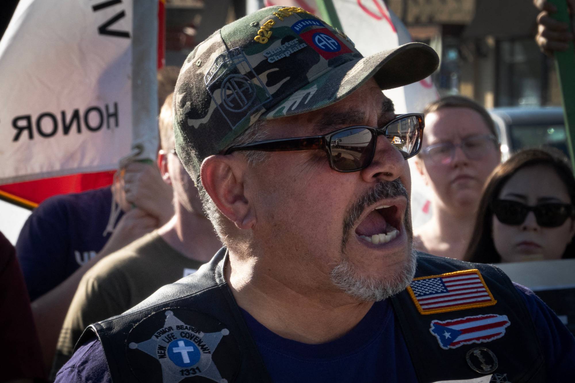 تجمَّعت مجموعة صغيرة من المحاربين القدامى والعاملين في مجال الرعاية الصحية والمؤيدين لهم خارج «مستشفى إدوارد هاينز جونيور» التابع لوزارة شؤون المحاربين القدامى احتجاجاً على استخدام إدارة الهجرة والجمارك جزءاً من المنشأة لتسهيل حملة منظمة من قِبل إدارة ترمب ووزارة الأمن الداخلي لملاحقة وترحيل المهاجرين غير الشرعيين في منطقة شيكاغو (أ.ف.ب)