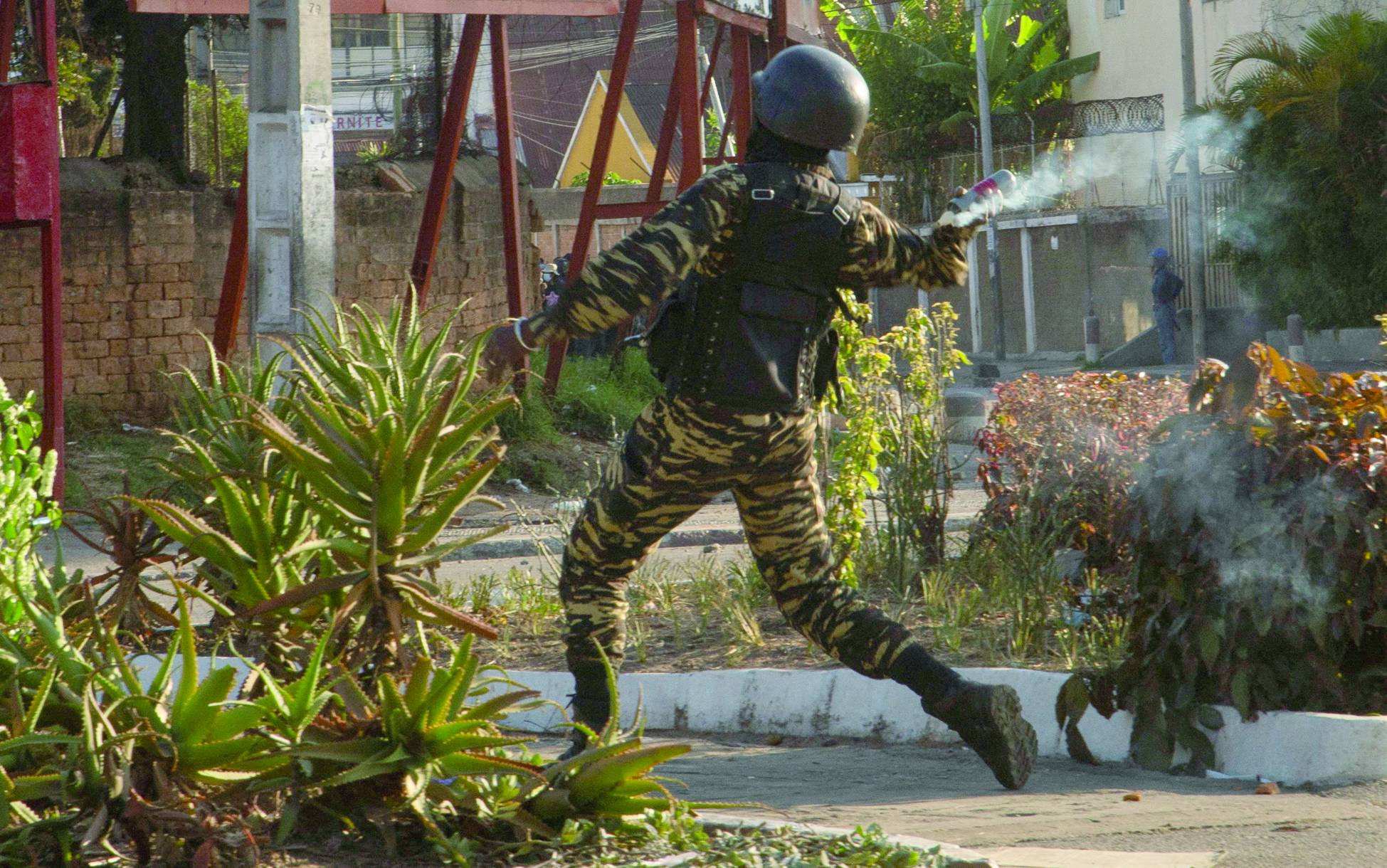 أحد عناصر الشرطة (الدرك) في مدغشقر يلقي بقنبلة غاز مسيل للدموع باتجاه المتظاهرين في العاصمة تناناريف (رويترز)