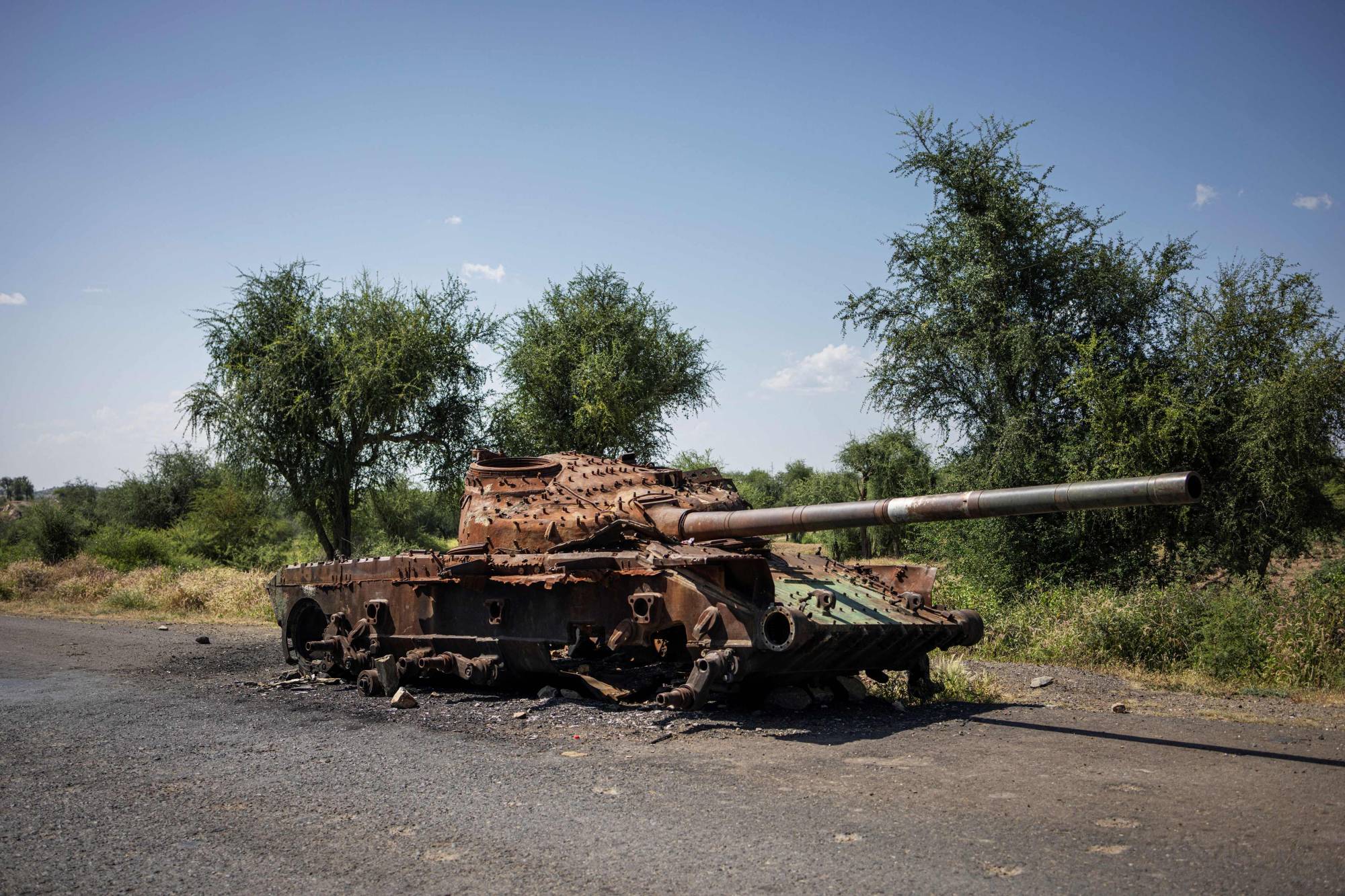 دبابة «تي 72» مدمرة على جانب الطريق خلال الاشتباكات بين الجيش الإثيوبي و«جبهة تحرير شعب تيغراي» 12 أكتوبر 2024 (أ.ف.ب)