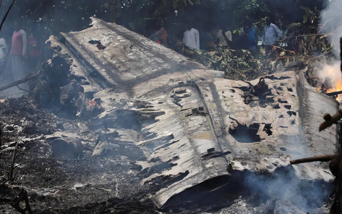 مدنيون يقفون بالقرب من حطام طائرة مشتعلة تحطمت بعد وقت قصير من إقلاعها من مطار جوبا جنوب السودان 2 نوفمبر 2021 (رويترز)