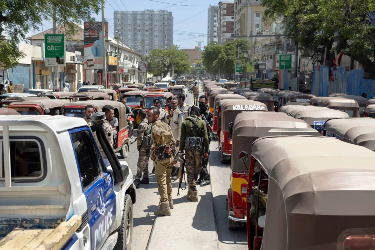 ضباط شرطة صوماليون يسيرون على طول حاجز وسط الطريق أثناء دوريتهم في شارع مزدحم بمقديشو 10 نوفمبر 2025 (أ.ف.ب)