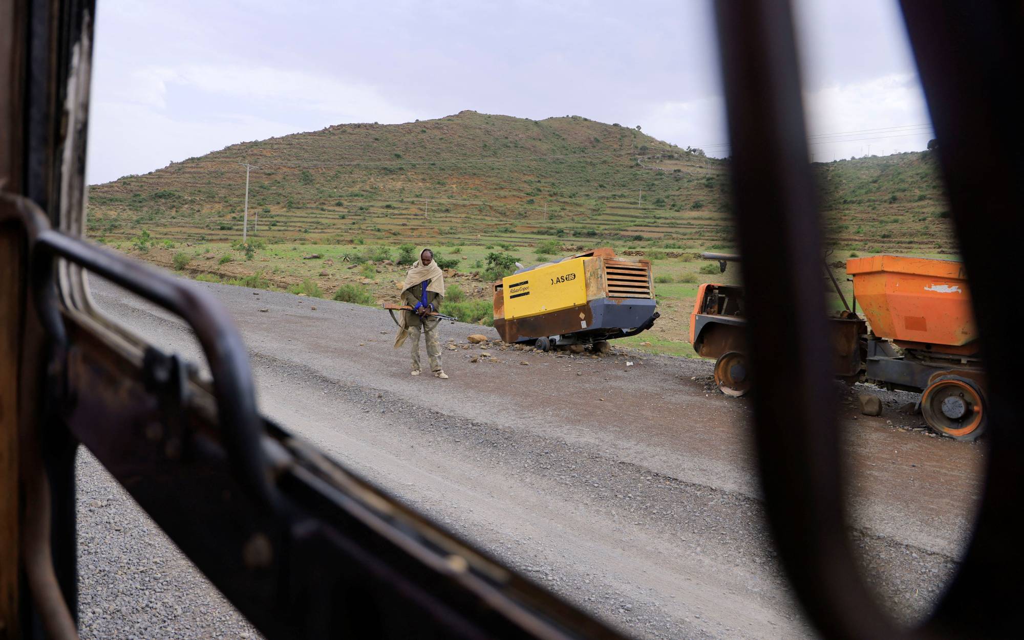 عضو من ميليشيات تيغراي يقف بجانب آلات بناء دُمرت أثناء القتال (أرشيفية - رويترز)