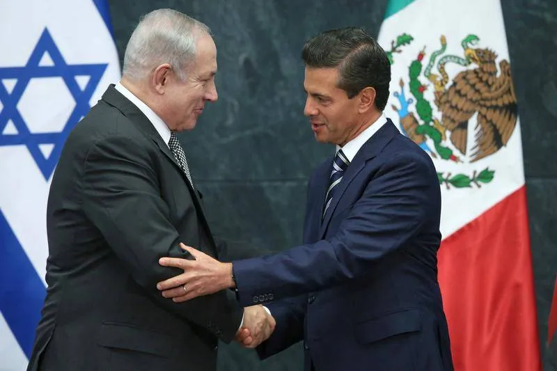 رئيس الوزراء الإسرائيلي بنيامين نتنياهو يتحدث مع الرئيس المكسيكي إنريكي بينا نييتو خلال خطاب لوسائل الإعلام في المقر الرئاسي في لوس بينوس في مكسيكو سيتي بالمكسيك 14 سبتمبر 2017 (رويترز)