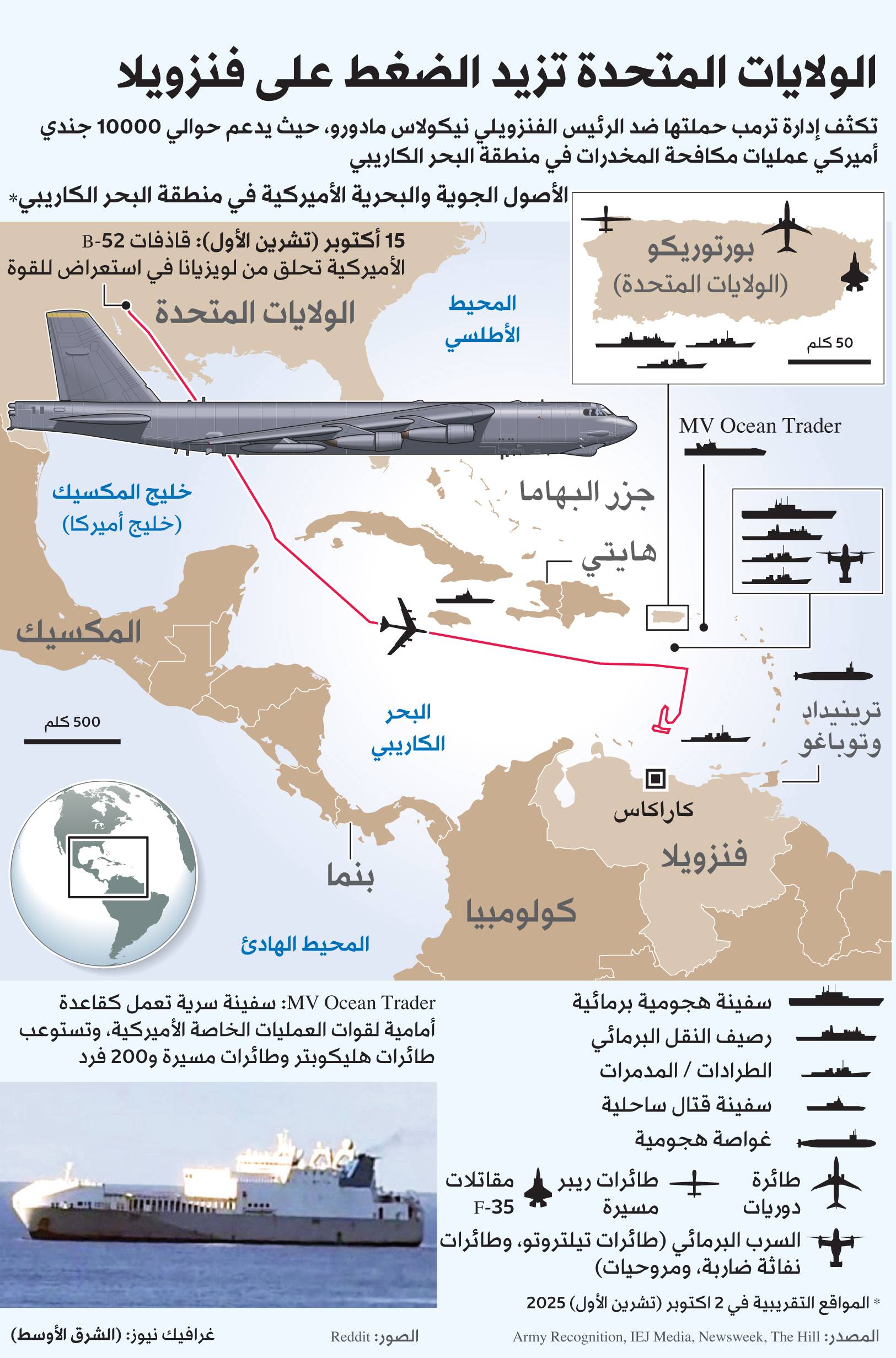 وتكثّف الولايات المتحدة ضغوطها على فنزويلا بأشكال عدة، منها توجيه ضربات أميركية على قوارب قيل إنها تهرب مخدرات في البحر الكاريبي، وتهديدات ترمب المتكررة بتوسيع نطاق العمليات العسكرية لتشمل البر، وتصنيف جماعة «دي لوس سوليس» التي تقول إدارة ترمب إنها تضم مادورو، منظمة إرهابية أجنبية.