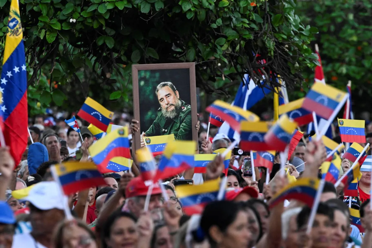 متظاهرون يحملون في هافانا صور فيدل كاسترو وأعلاماً فنزويلية تضامناً مع هذا البلد عقب الحشد العسكري الأميركي يوم 17 أكتوبر (رويترز)