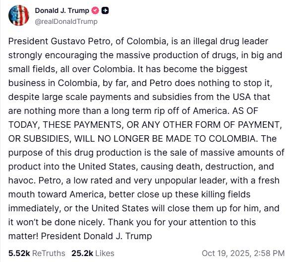 أعلن الرئيس الأميركي دونالد ترمب، الأحد، إنهاء المساعدات المالية لكولومبيا، مُتِّهماً رئيسها غوستافو بيترو بعدم مكافحة المخدرات. وكتب ترمب على منصته الاجتماعية «تروث سوشال»: «من الآن فصاعداً، لن يتم تقديم هذه المدفوعات، أو أي شكل آخر من أشكال المدفوعات أو المساعدات» إلى كولومبيا، من دون أن يحدد المدفوعات المعنية. وقال إن نظيره الكولومبي «لا يفعل شيئاً لوقف» إنتاج المخدرات، واتَّهمه بأنه «بارون مخدرات يشجع بقوة الإنتاج الضخم للمخدرات» في بلاده.