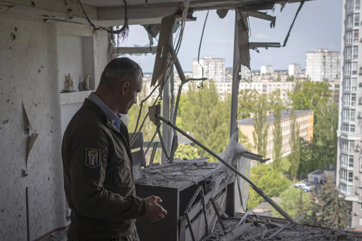 رئيس بلدية كييف فيتالي كليتشكو يقف أمام مبنى سكني دُمّر بفعل هجوم بمسيّرة في كييف الاثنين (أ.ب)