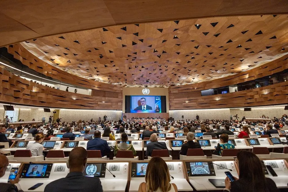 جانب من جلسات الجمعية السنوية لمنظمة الصحة العالمية في جنيف (رويترز)