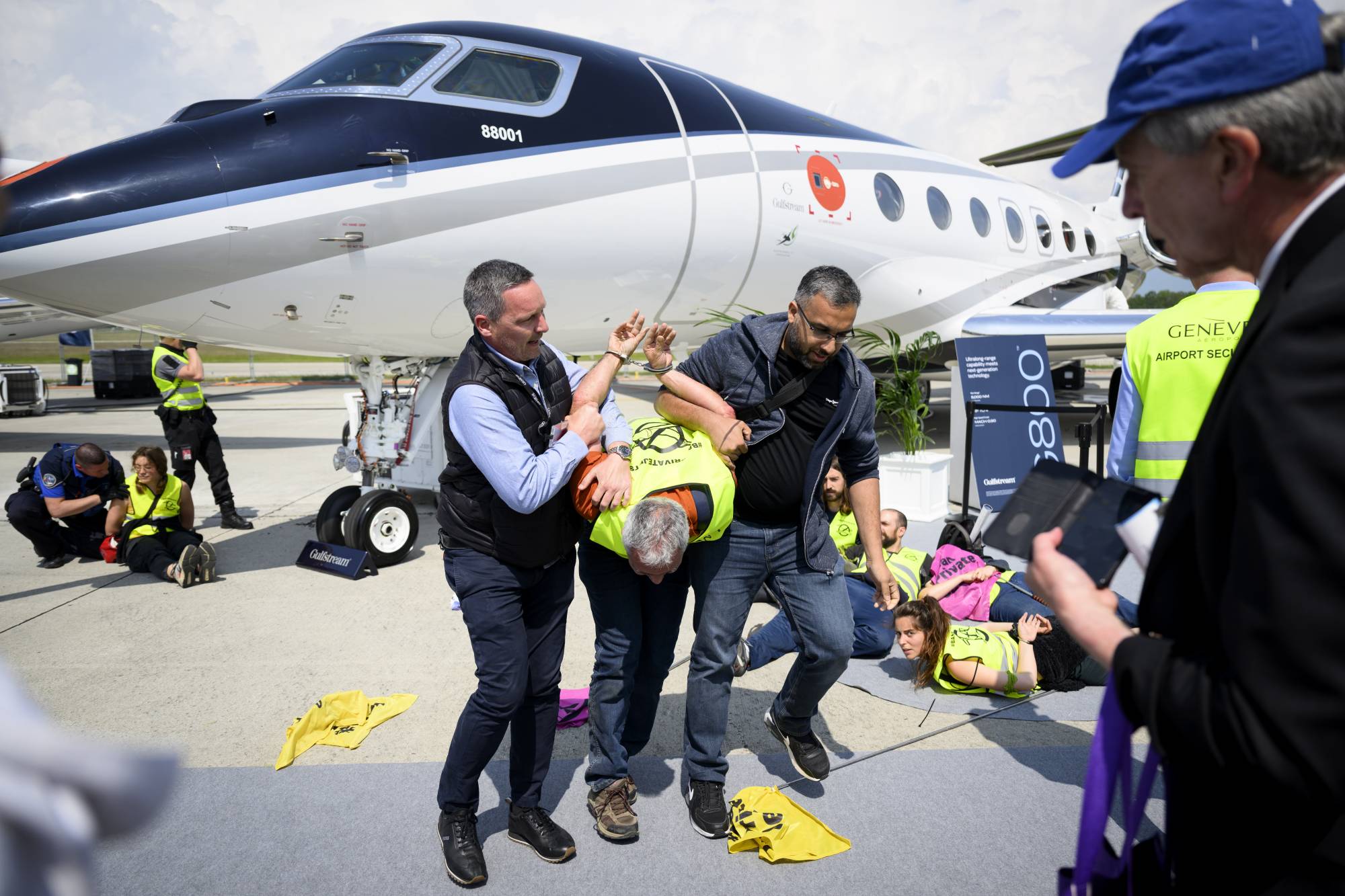 تسبّب عشرات الناشطين في مجال التغيّر المناخي بوقف الحركة الجوية مؤقتاً في جنيف، الثلاثاء، قبل أن يتم إجلاؤهم من أكبر معرض لطيران الأعمال في أوروبا، بعدما قَيّدوا أنفسهم ببعض الطائرات الخاصة.