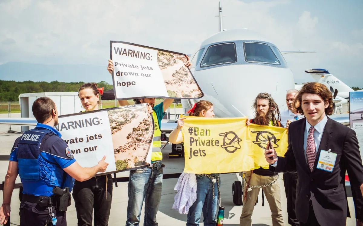 وعطل عشرات الناشطين معرض طيران الأعمال (يوروبيان بيزنس أفيايشن كونفينشن أند إكزيبيشن - EBACE)، الذي يقام هذا الأسبوع على أطراف مدارج المطار الدولي. وتُظهر صور نشرها مدافعون عن البيئة على «تويتر» ناشطين يرفعون لافتات وهم جالسون بالقرب من طائرات أو مانعون الدخول إلى المقصورة. وتمكن البعض من تقييد أنفسهم بالطائرات.