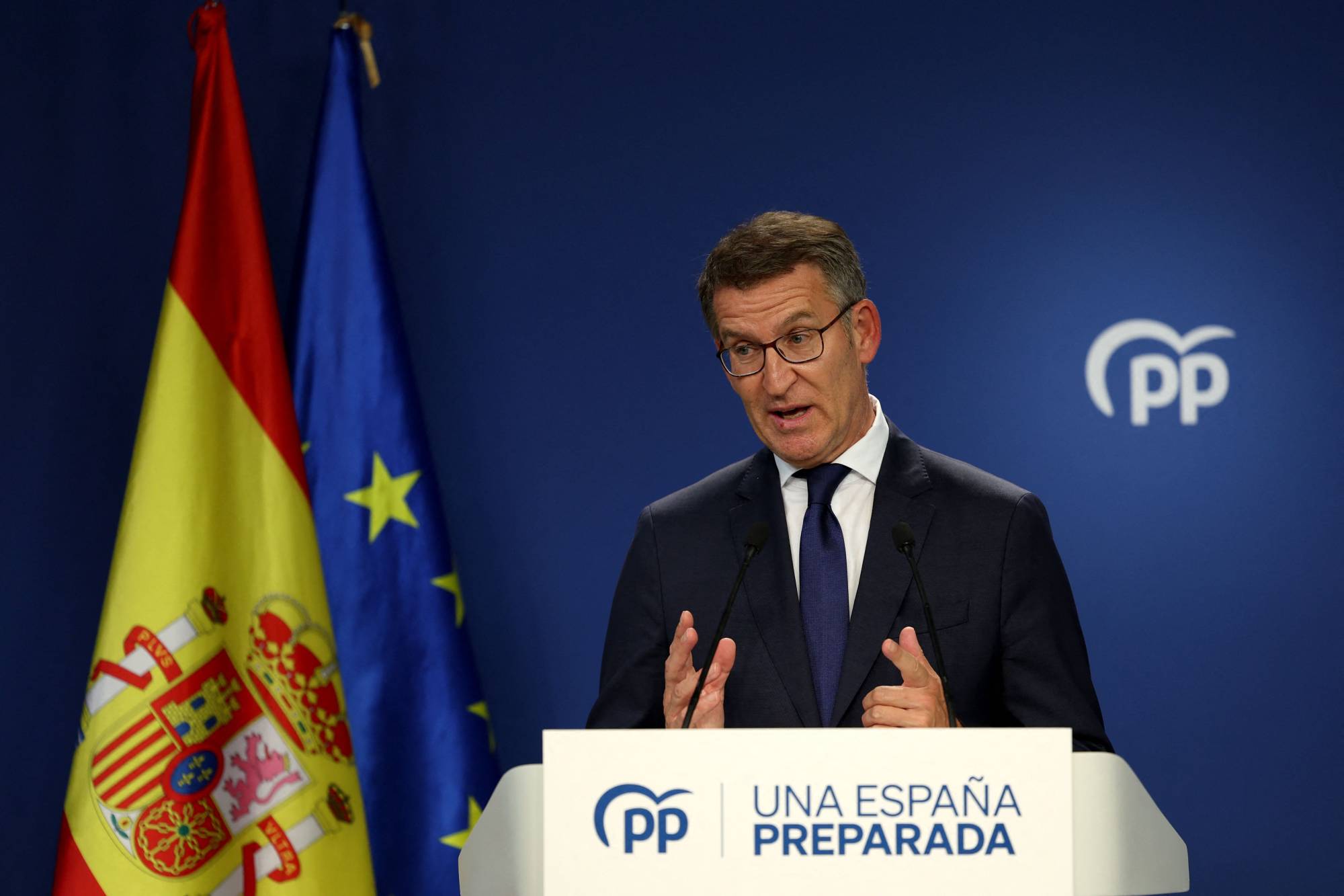زعيم الحزب الشعبي اليميني ألبرتو نونيس فيخو في مؤتمر صحافي في المقر الرئيس للحزب بمدريد الاثنين (أ.ف.ب)