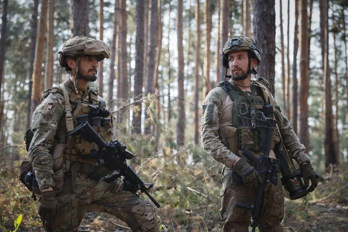 جنديان أوكرانيان خلال عملية قتالية على خط المواجهة بالقرب من كريمينا منطقة لوغانسك (أ.ب)
