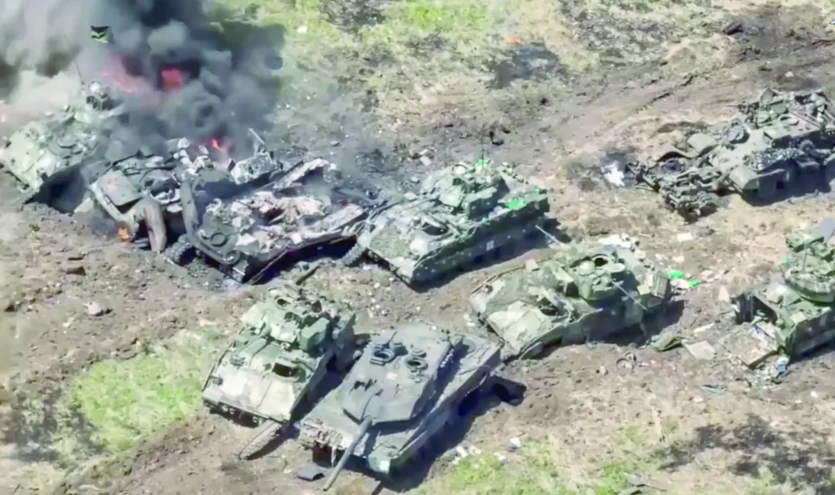 صورة وزعتها وزارة الدفاع الروسية أمس لدبابات أوكرانية محترقة خلال صد "الهجوم المضاد" في جنوب أوكرانيا (إ.ب.أ)