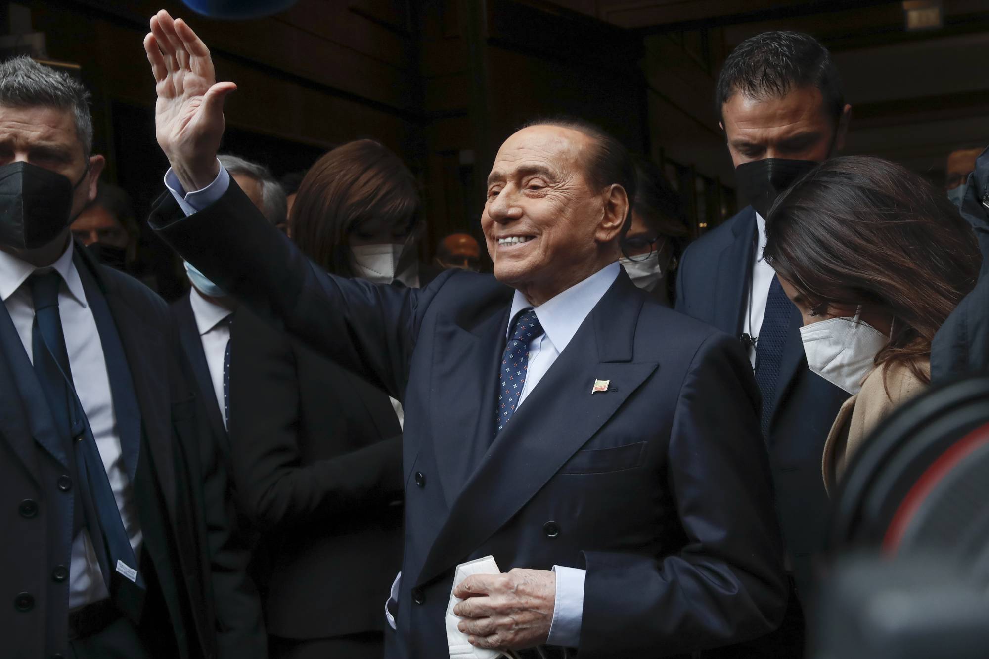 سيلفيو برلسكوني يحيي المراسلين لدى وصوله إلى مجلس النواب الإيطاي للقاء رئيس الوزراء آنذاك ماريو دراغي في فبراير 2021 (أ.ب)