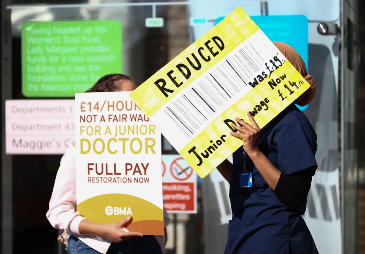 خلال اعتصام لأطباء في مدينة مانشستر يعملون ضمن نظام الرعاية الصحية (إ.ب.أ)