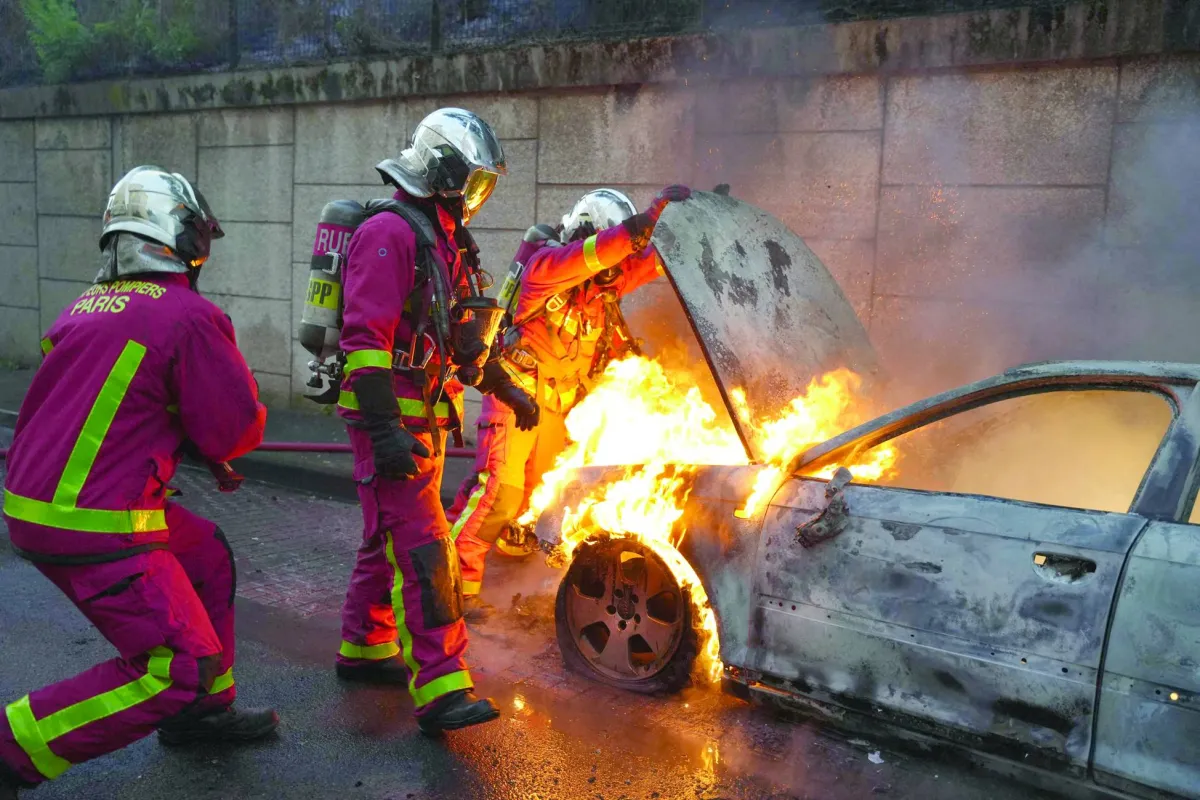 رجال الإطفاء يخمدون نيران سيارة محترقة بعد صدامات في نانتير غرب باريس يوم 27 يونيو (أ.ف.ب)