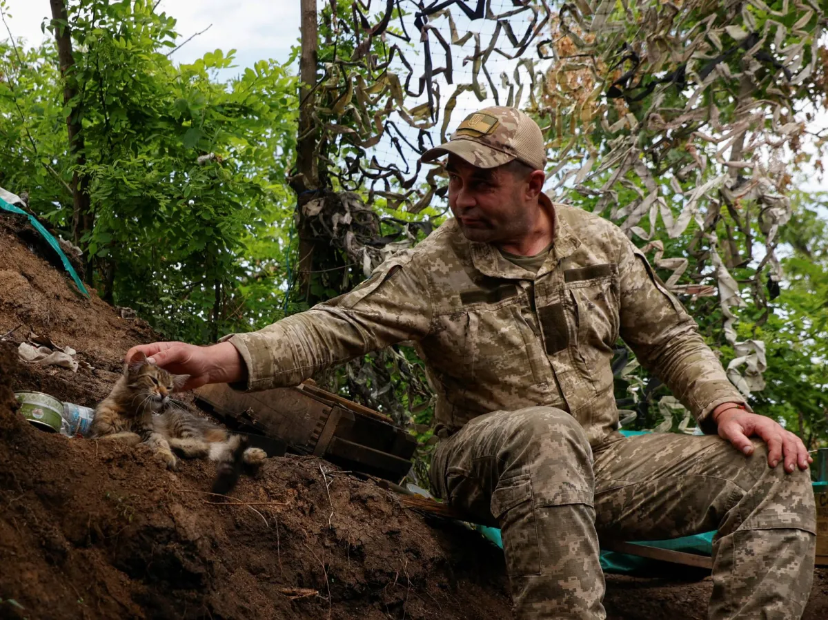 جندي أوكراني يداعب قطة في قرية نوفودارفيكا التي استعادت أوكرانيا السيطرة عليها مؤخراً (رويترز)
