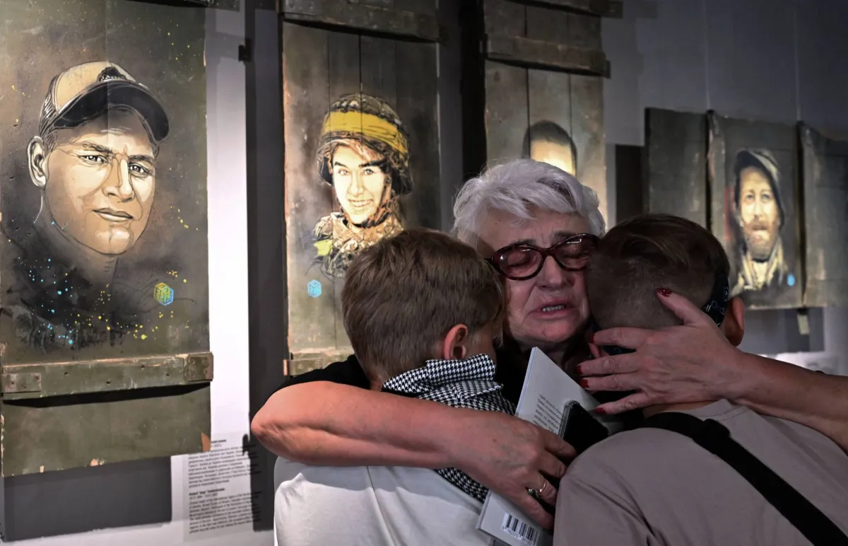 أوكرانيون أقارب لجنود قُتلوا بالحرب خلال عرض صورهم بمعرض (الحرب في أوكرانيا) بمركز المعارض بـ«متحف الحرب» في كييف (أ.ف.ب)