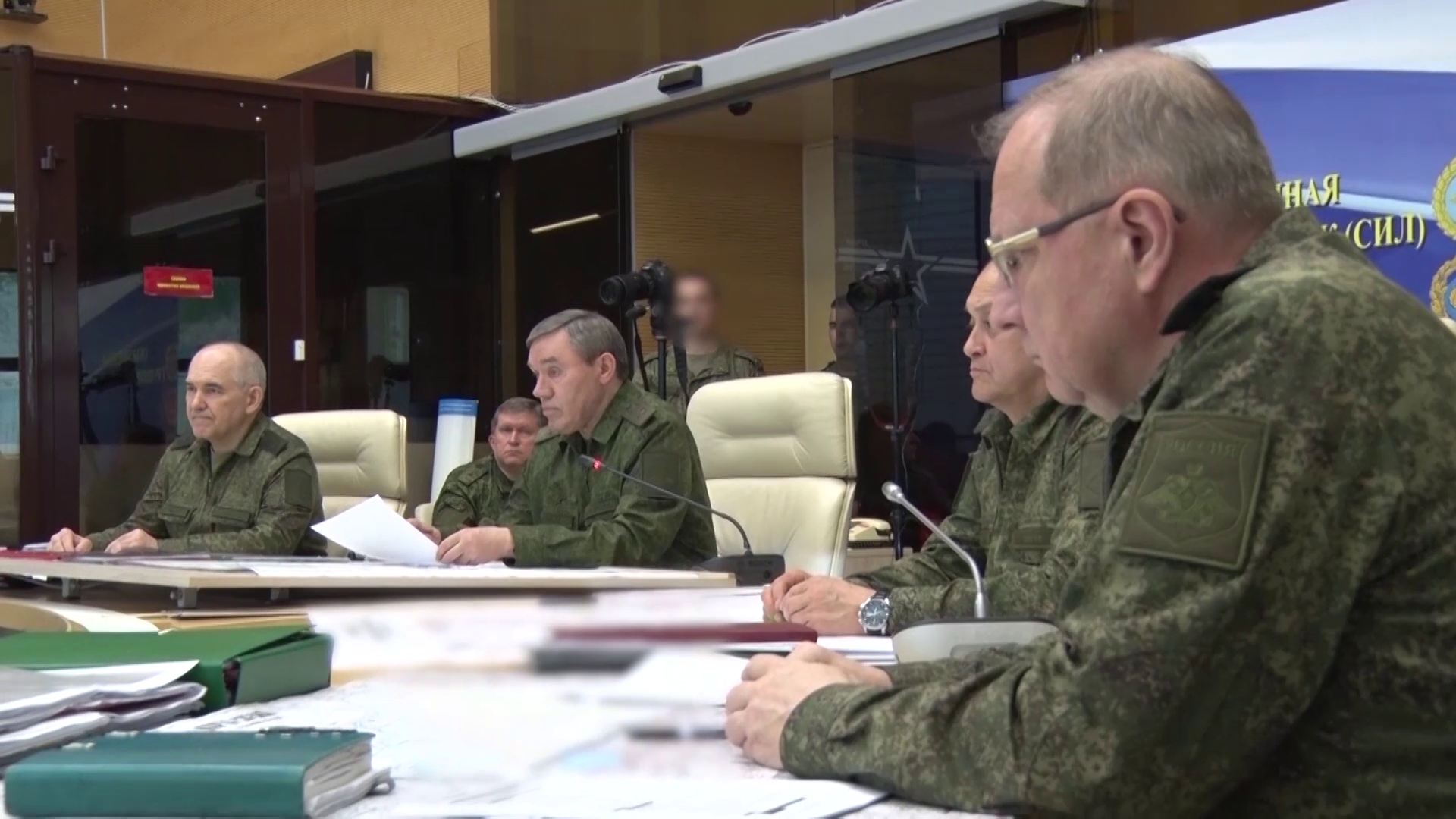 ظهر غيراسيموف في غرفة بمقر للقيادة العسكرية يجلس على مقعد من الجلد الأبيض ويترأس اجتماعاً لكبار الجنرالات