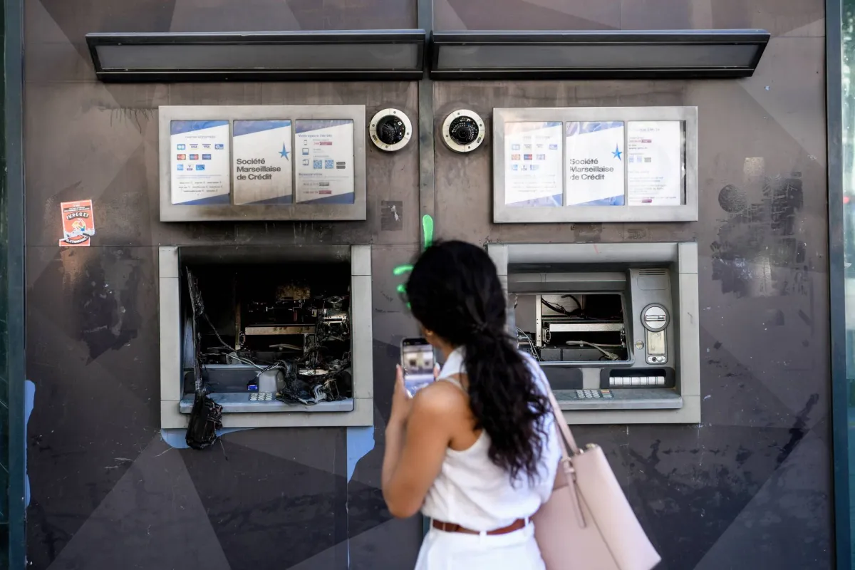 امرأة تصوّرصرافين آليين متضررين في مدينة مارسيليا (د.ب.أ)