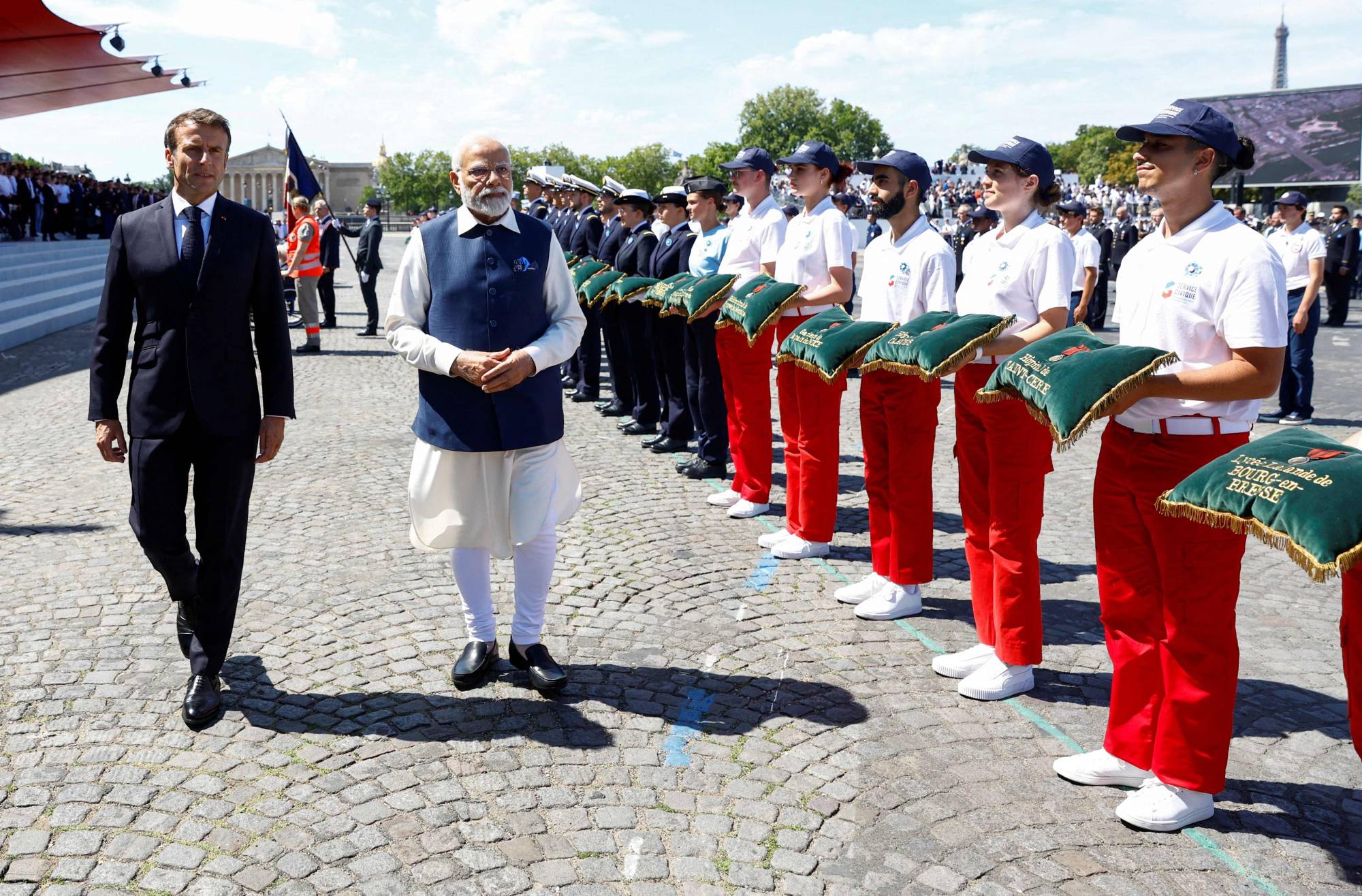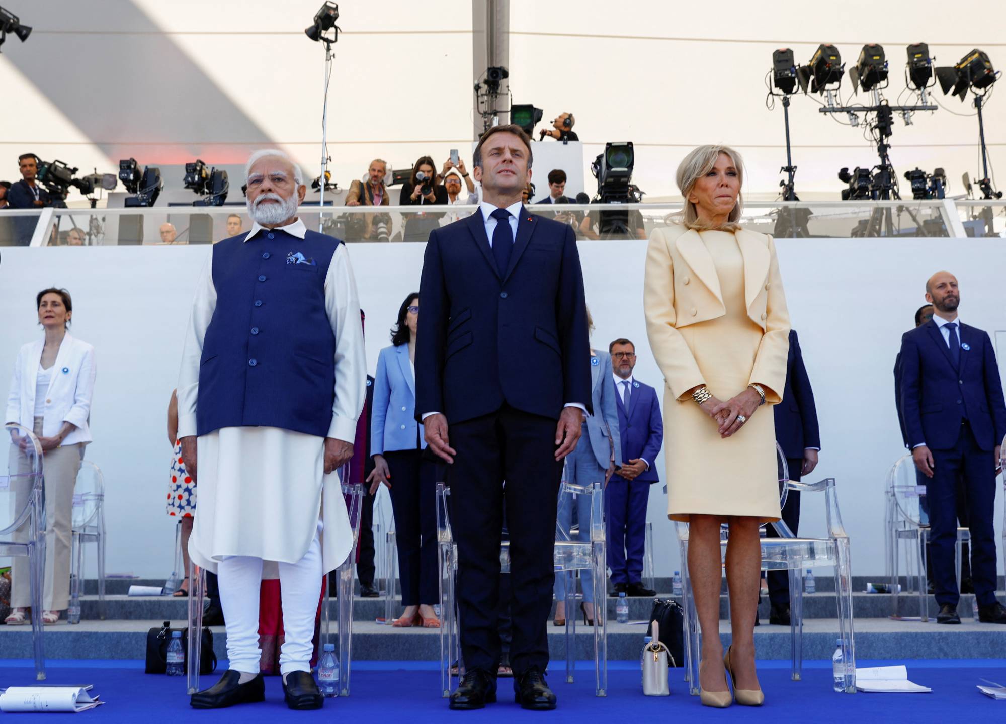 وقبلها، جلس مودي إلى يمين الرئيس إيمانويل ماكرون في المنصة التي نُصبت في ساحة الكونكورد لمشاهدة العرض العسكري التقليدي بمناسبة العيد الوطني الفرنسي، حيث كانت الهند «ضيف الشرف». وبرّرت الرئاسة الفرنسية ذلك مؤكدةً أن تكريم الهند يعود لمرور 25 سنة على الشراكة الاستراتيجية المبرمة بين البلدين، بعد توقيع صفقة شراء 6 غواصات فرنسية الصنع عام 2005، كانت أولى بواكير التعاون العسكري والدفاعي بين البلدين.