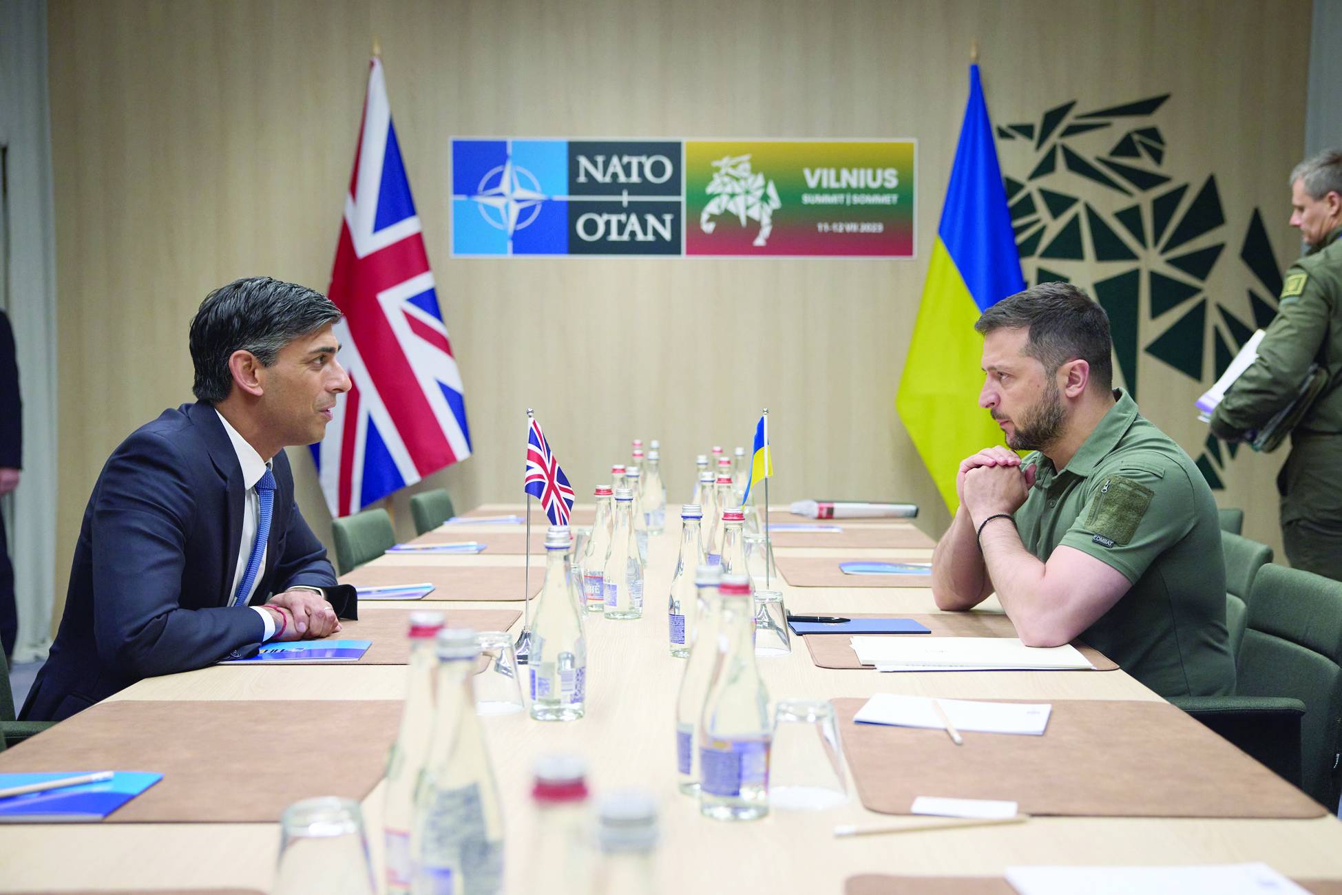 رئيس الوزراء البريطاني ريشي سوناك خلال اجتماع له مع الرئيس الأوكراني بالعاصمة الليتوانية على هامش قمة «الناتو» (إ.ب.أ)