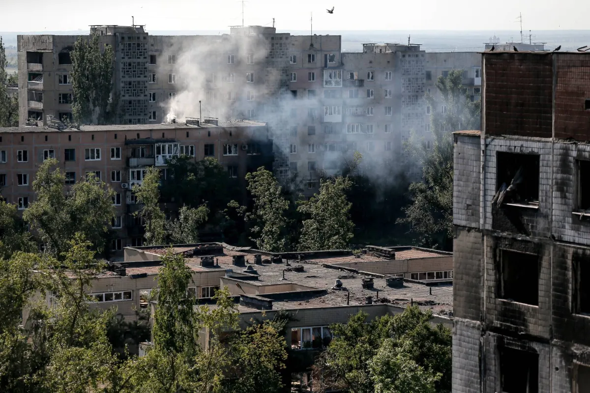 الدخان يتصاعد فوق المباني السكنية المدمرة نتيجة القصف في منطقة دونيتسك (إ.ب.أ)