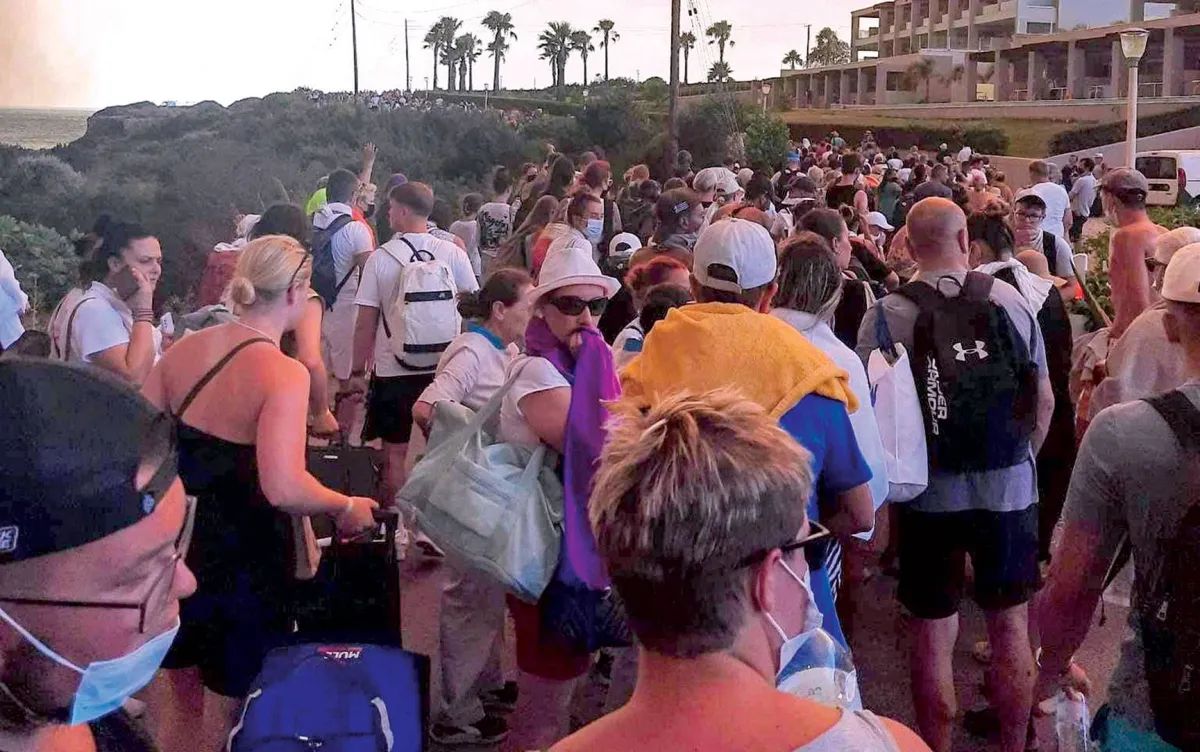 سياح بعد إجلائهم من فندق في جزيرة رودس اليونانية مساء أول من أمس (أ.ف.ب)